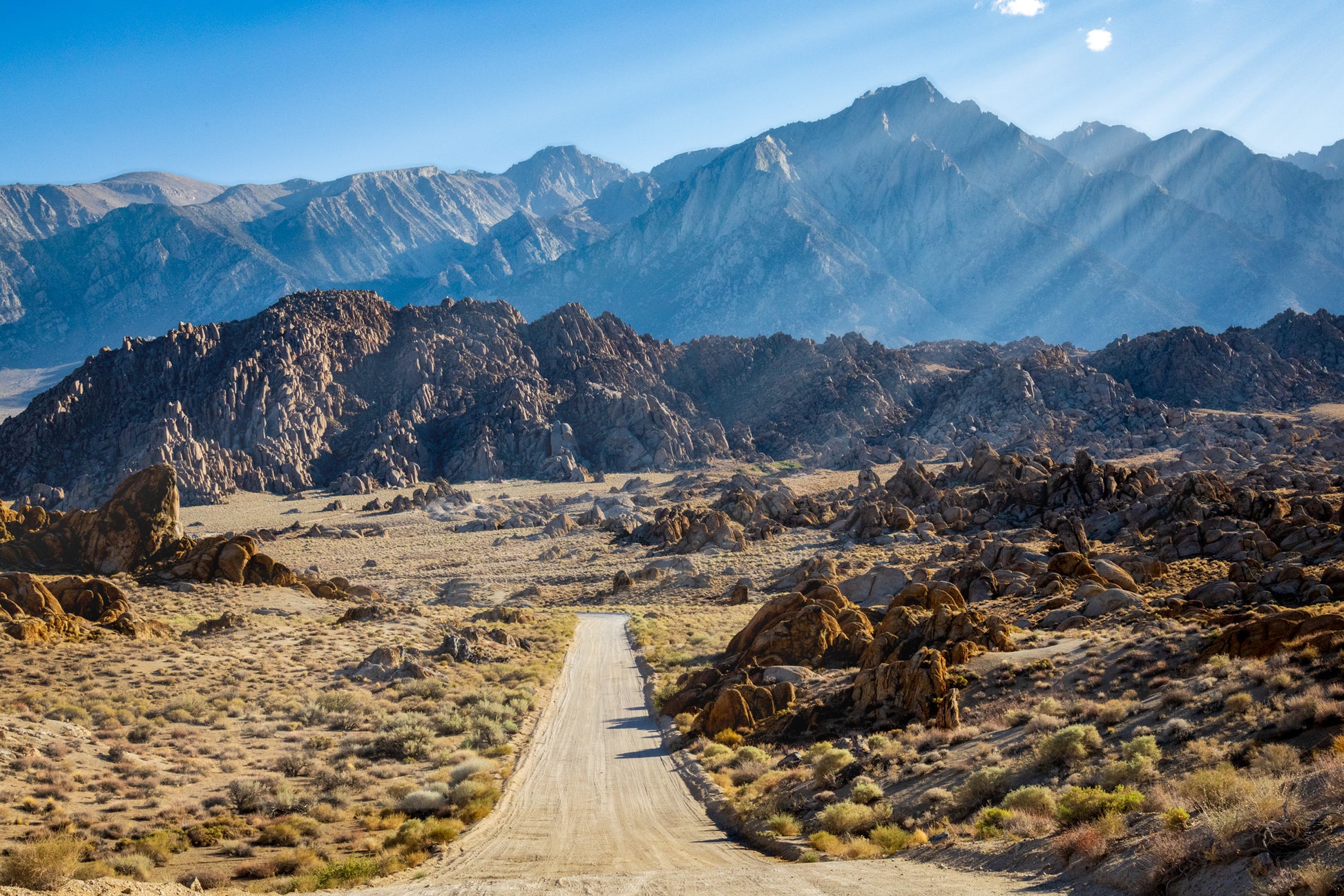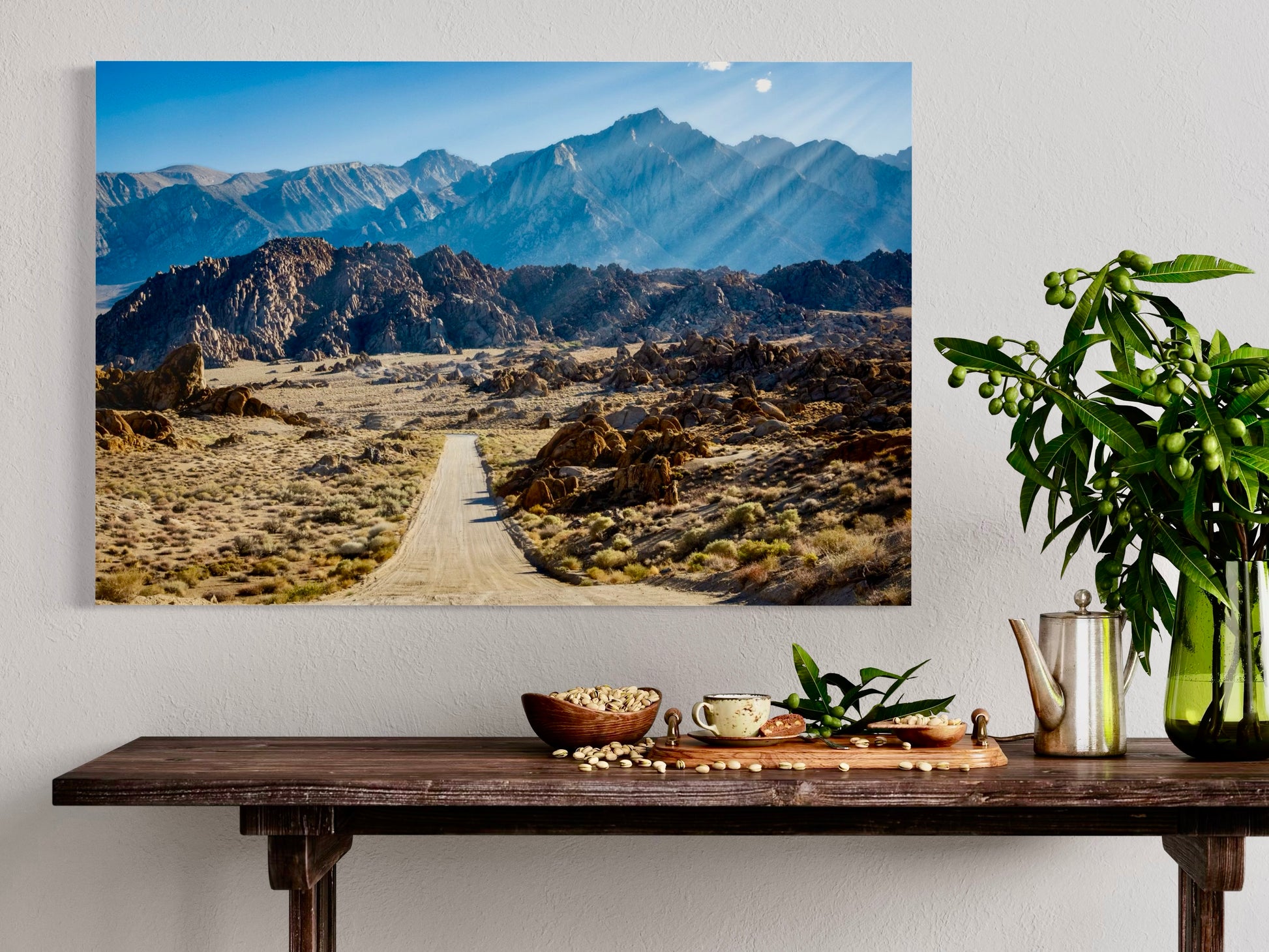 Bring the spirit of adventure into your home with this stunning Alabama Hills landscape metal print. Featuring a dirt road stretching toward dramatic rock formations under beams of sunlight, this photograph captures the raw beauty of California’s Eastern Sierra. The high-gloss metal surface enhances the natural colors and textures while offering a durable, fade-resistant finish that’s lightweight and easy to hang. Whether you’re decorating a rustic cabin, a modern office, or a cozy home, this piece adds warmth, depth, and inspiration. A perfect gift for hikers, travelers, and anyone who loves wide open landscapes.