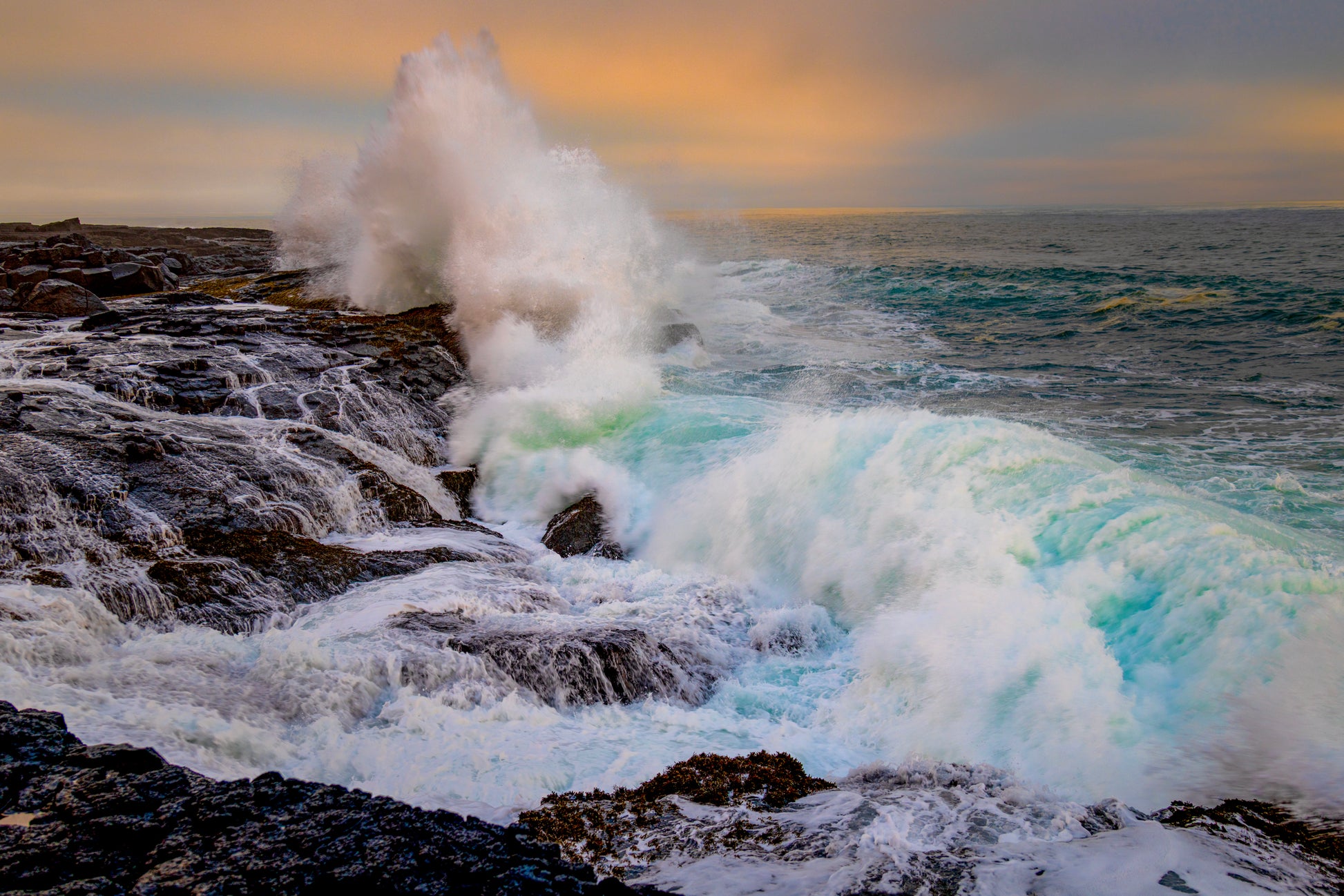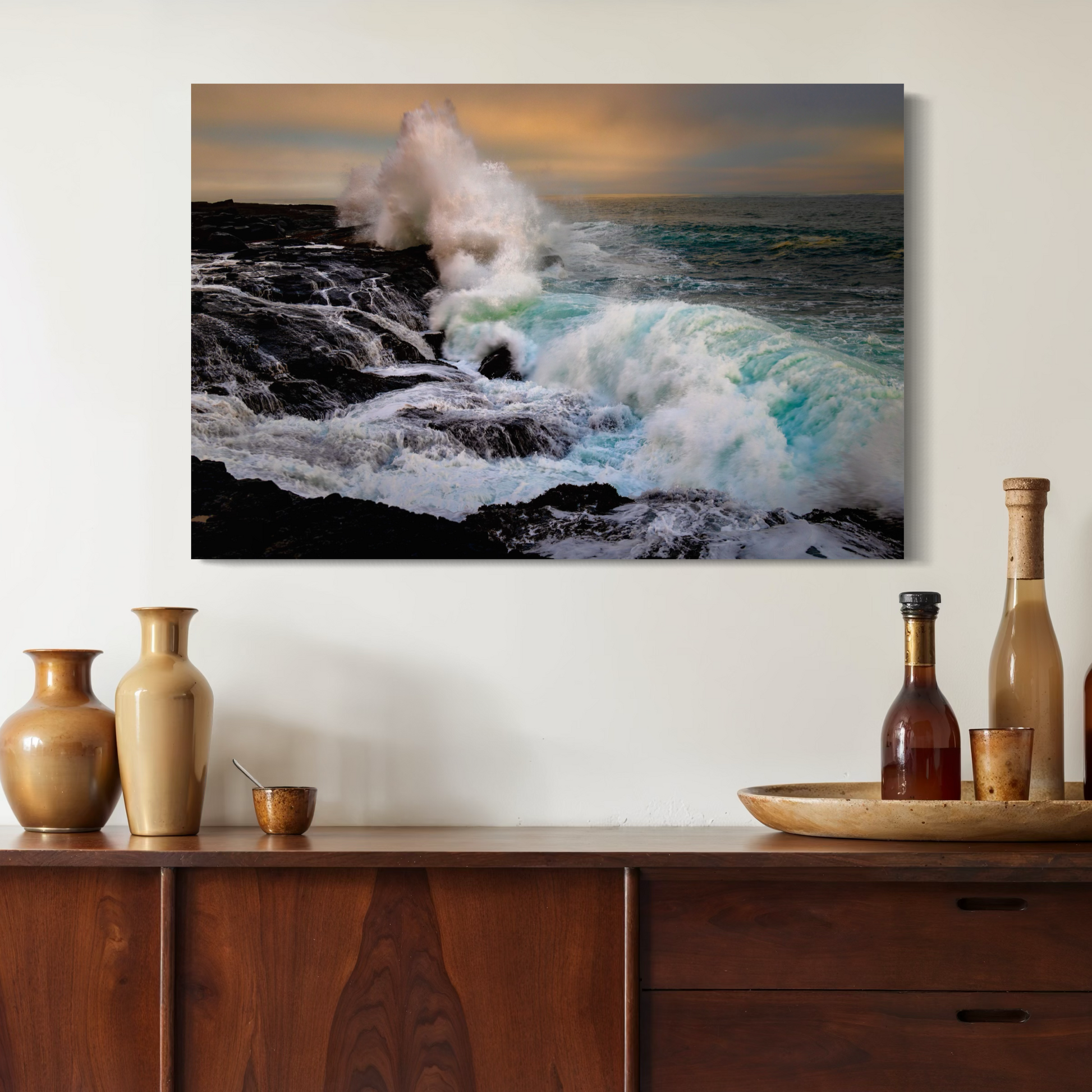 Golden-hour light softens the Icelandic coast as powerful waves explode against dark volcanic rock, frozen in a moment of raw energy. Cool turquoise water and warm pastel skies collide, creating a striking balance of calm and force. Printed on metal, the luminous highlights and deep textures give this scene exceptional depth and impact.