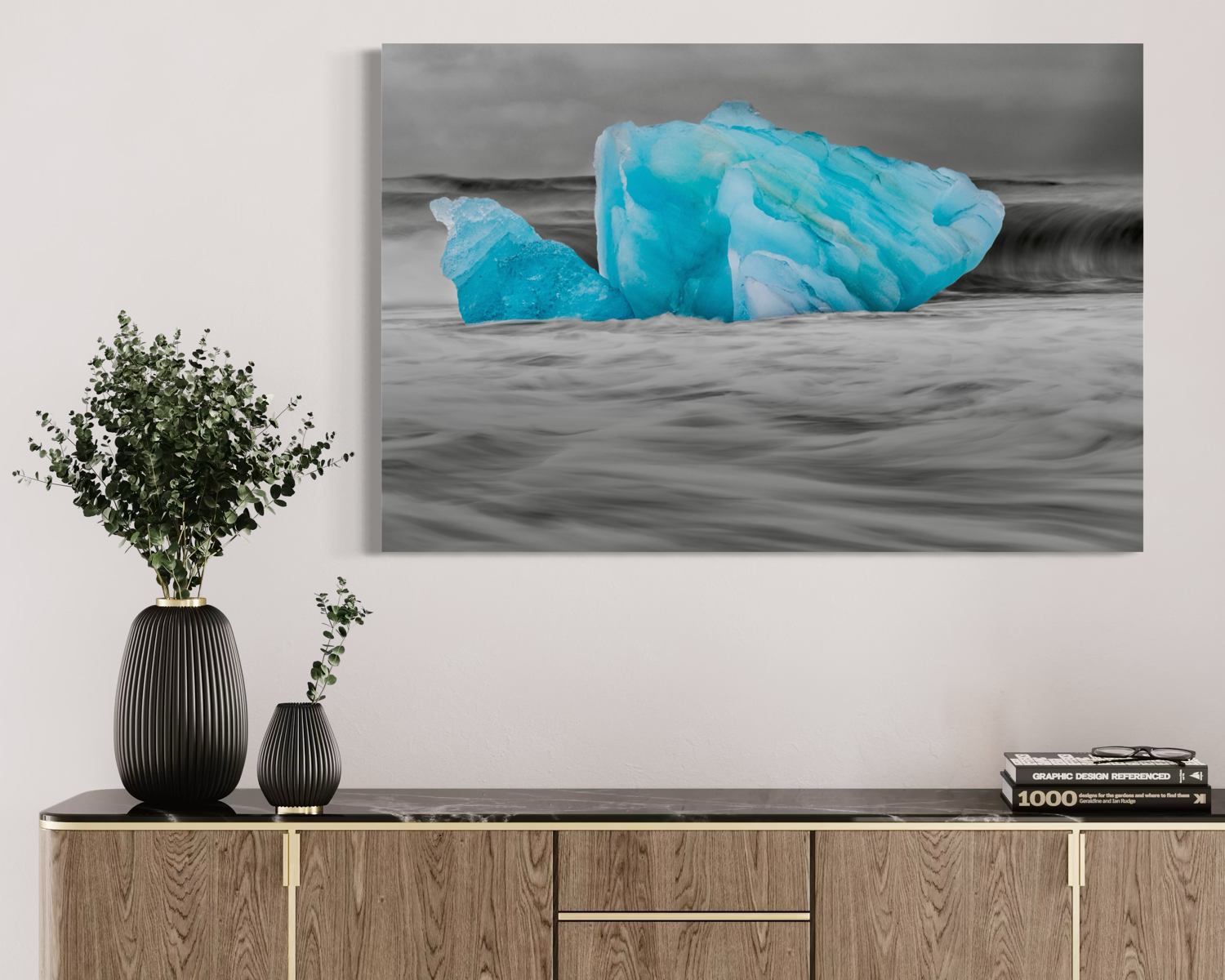 A luminous iceberg glows in shades of electric blue, rising from a sea of soft, silver motion. The contrast between vibrant ice and blurred monochrome waves creates a scene that feels both surreal and powerful. Printed on metal, the radiant color and sculpted textures command attention with striking clarity and depth.